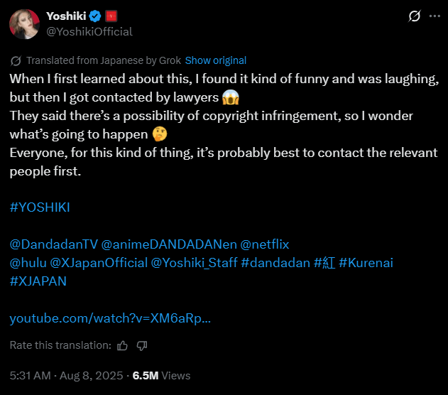 O músico japonês Yoshiki, líder e baterista da banda de rock X JAPAN, revelou em suas redes sociais que foi contatado por advogados após o lançamento da música “Hunting Soul”, apresentada no episódio 18 de DAN DA DAN (2ª temporada, episódio 6). Segundo o próprio artista, a faixa traz claras referências ao som e à estética do grupo, o que levantou dúvidas sobre possíveis questões de direitos autorais.