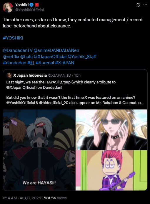 Vale lembrar que a subsidiária Aniplex, da Sony Music, é coprodutora do anime DAN DA DAN. No entanto, Yoshiki afirmou que não foi informado previamente sobre a homenagem, levantando dúvidas sobre como ocorreu o processo de autorização.