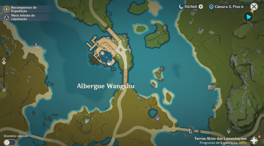 Chegando próximo de Liyue, mais exatamente em Albergue Wangshu, temos dois locais próximos onde você poderá farmar os dois tipos de Koi que podem ser capturados utilizando isca de Mosca Falsa.