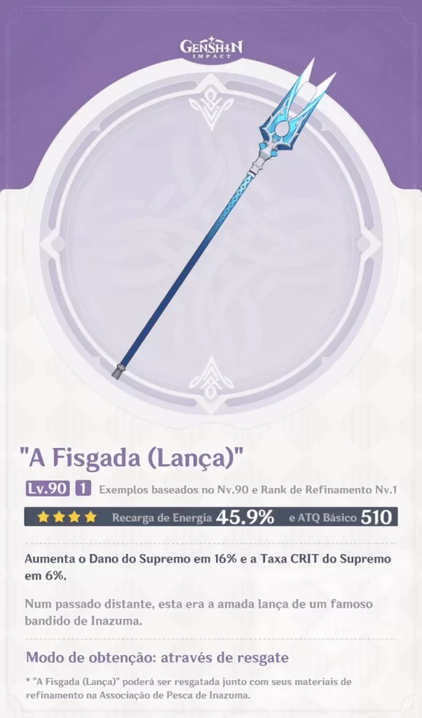 Recentemente adicionada ao jogo, a lança com o nome de “A Fisgada” vem sendo muito popular entre os jogadores, pois ela é bastante útil para a nova personagem Baal, também conhecida como Shogun Raiden de Genshin Impact.